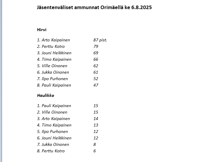 Jäsentenväliset hirvi- ja haulikkoammunnat Orimäellä pe 12.8.2022.